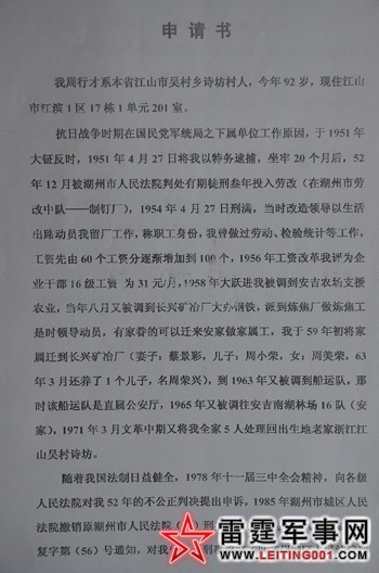 鉴于我在错案被强制劳改,连坐牢共有20年之久,今特要求浙江省司法厅、劳改局,给予我被改造生活出路之旨意,俾予退休生活费以度不多晚年。