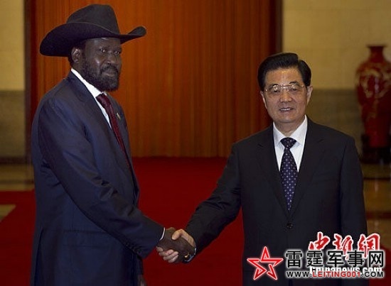 4月24日,中国国家主席胡锦涛在北京人民大会堂与来华访问的南苏丹共和国总统基尔举行会谈。